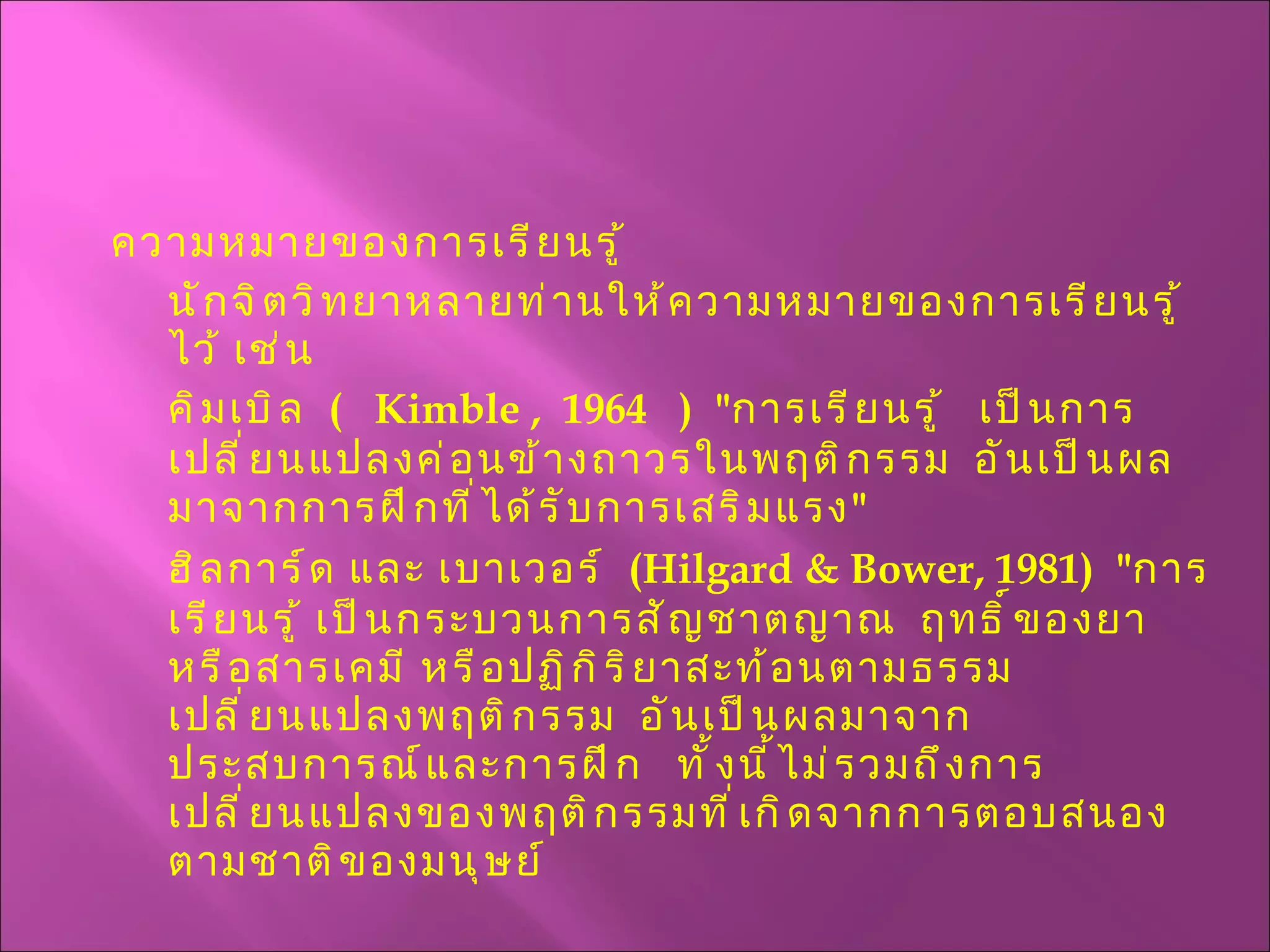 ความหมายของการเรียนรู้ นักจิตวิทยาหลายท่านให้ความหมายของการเรียนรู้ไว้ เช่นคิมเบิล ( Kimble , 1964 ) " การเรียนรู้ เป็นการเปลี่ยนแปลงค่อนข้างถาวรในพฤติกรรม อันเป็นผลมาจากการฝึกที่ได้รับการเสริมแรง " ฮิลการ์ด และ เบาเวอร์ ( Hilgard & Bower, 1981 ) " การเรียนรู้ เป็นกระบวนการสัญชาตญาณ ฤทธิ์ของยา หรือสารเคมี หรือปฏิกิริยาสะท้อนตามธรรมเปลี่ยนแปลงพฤติกรรม อันเป็นผลมาจากประสบการณ์และการฝึก ทั้งนี้ไม่รวมถึงการเปลี่ยนแปลงของพฤติกรรมที่เกิดจากการตอบสนองตามชาติของมนุษย์ - 3.