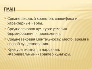 Документ описывает средневековую культуру, её характерные черты и развитие, охватывая периоды от раннего до позднего средневековья. Рассматриваются аспекты социальной стратификации, философских и эстетических концепций, а также влияние религии и карнавального духа на народные и элитные культуры. Обсуждается связь между культурными традициями и историческим контекстом, включая роль рыцарской культуры и приключений бродячих поэтов.