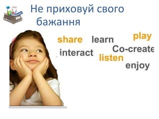 І n vinoveritas www.youtube.com/watch?v=hXaHBmxWkyk&feature=mfu_in_order&list=UL Розкажи захоплення Запитуй читачів, що вони хочуть почути Можна інтегрувати всі соцмережі Будь щирим Спілкуйся з однодумцями ПРИСТРАСТЬ ДО СПРАВИ