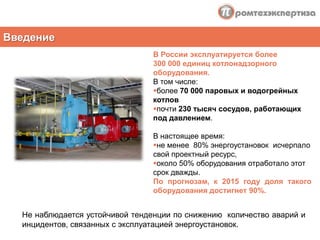 Документ анализирует проблемы промышленной безопасности при эксплуатации котельных установок в России, акцентируя внимание на высоком уровне аварийности из-за устаревшего оборудования и недостаточной квалификации персонала. Более 80% энергоустановок исчерпало свой проектный ресурс, что приводит к инцидентам и авариям, многие из которых вызваны сочетанием технических неисправностей и отсутствием должного контроля. Упоминаются множество нормативных документов, регулирующих безопасность эксплуатации котлов, но часто их требования нарушаются.