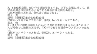 X、Yを位相空間、f:X→Yを連続写像とする。以下の主張に対して、真 である場合は証明を与え偽である場合には反例をあげよ。 (1)Xが連続であれば、像f(X)も連結である。 答え 真 証明 [斎藤毅]集合と位相p145 (2)Xがハウスドルフであれば、像f(X)もハウスドルフである。 答え