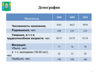 Доклад главы администрации большесосновского сельского поселения Петра Кожина о социально-экономическом развитии района за 2010 год и первое полугодие 2011 года включает данные о демографии, экономическом развитии и проблемах инфраструктуры. Численность населения составляет 5954 человека, с 123 родившимися и 91 умершими в трудоспособном возрасте. Основные проблемы включают необходимость реконструкции водопроводных сетей и капитального ремонта дорог.