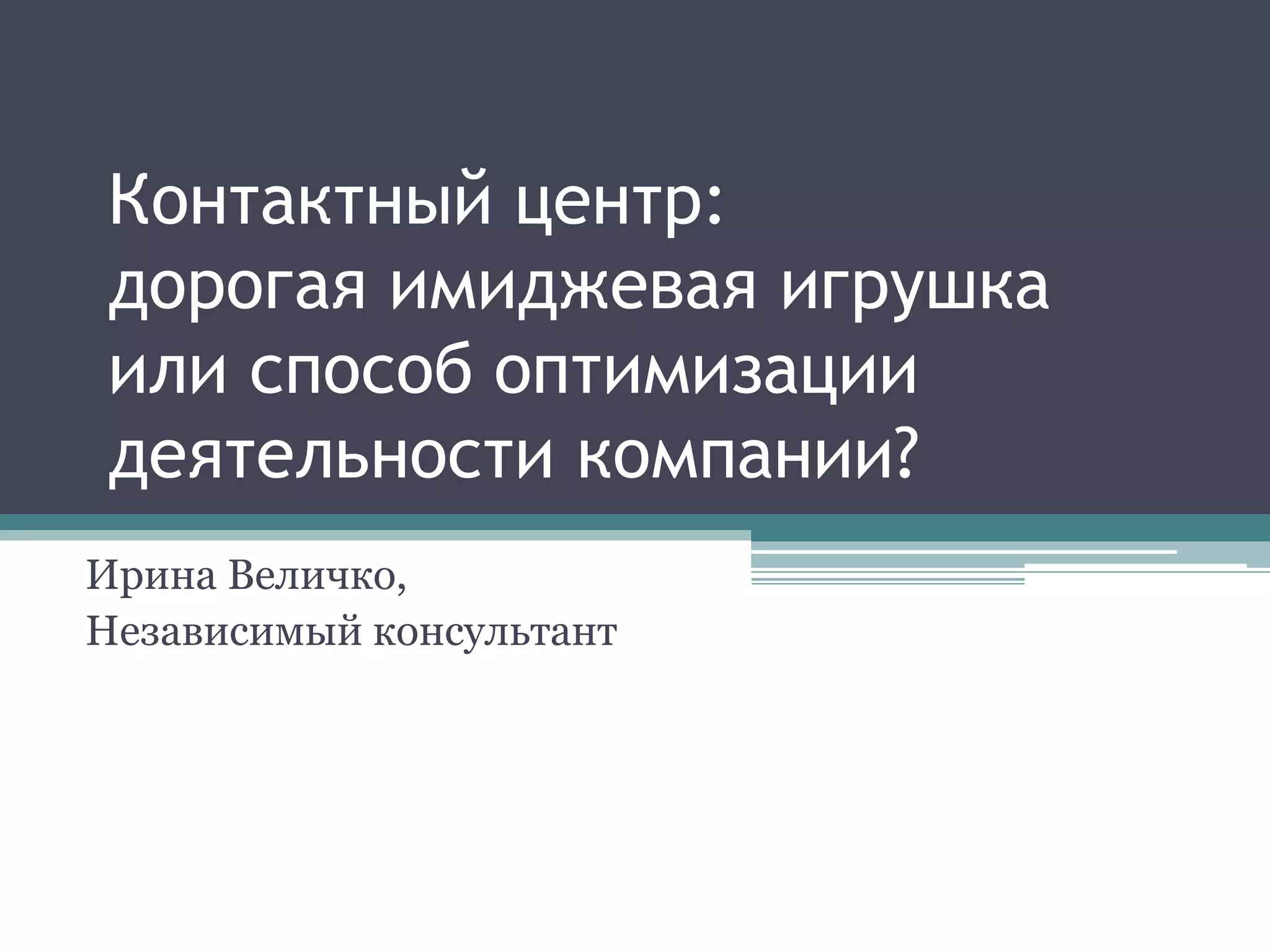 Документ обсуждает важность и роль контактного центра (КЦ) в организации, подчеркивая его значимость для оптимизации внутренних бизнес-процессов и повышения качества обслуживания клиентов. Автор, Ирина Величко, предлагает рассматривать КЦ как важный элемент, влияющий на эффективность компании, и делится рекомендациями по его внедрению и интеграции. В заключение подчеркивается необходимость знаний и опыта в управлении КЦ для достижения его максимальной эффективности.