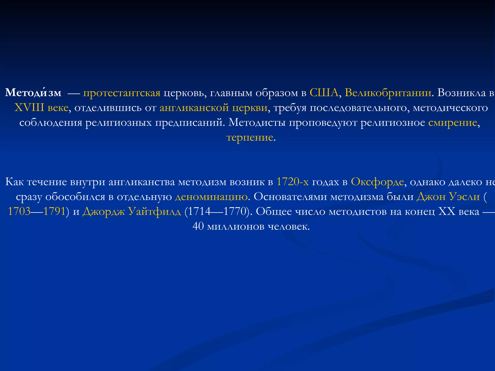 Методизм — это протестантская церковь, возникшая в XVIII веке в Великобритании и США, отделившаяся от англиканской церкви. Основателями были Джон Уэсли и Джордж Уайтфилд, и на конец XX века общее число методистов достигло 40 миллионов. Методисты акцентируют внимание на религиозном смирении и терпении.