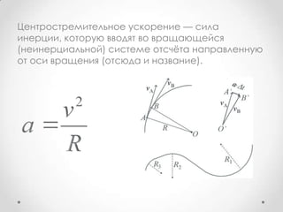 Документ описывает центростремительное ускорение как силу инерции в вращающейся системе отсчёта, направленную к центру движения. Приведены формулы и примеры задач, в которых необходимо определить скорость и ускорение объектов, движущихся по круговым траекториям, с учётом различных условий. Рассматриваются задачи, связанные с ускорением на экваторе Земли и движением поезда, а также радиус поворота конькобежца.