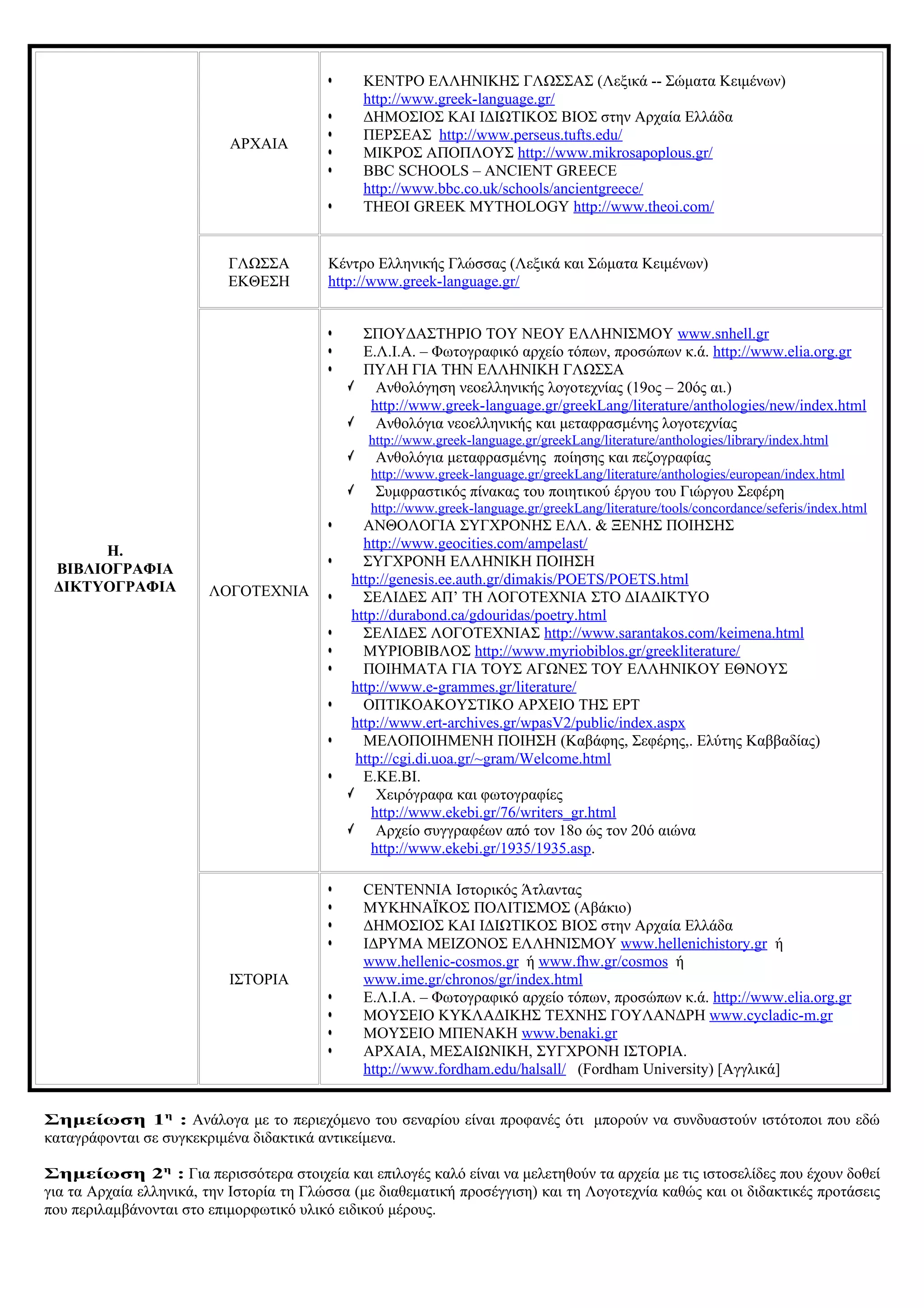 για τα Αρχαία ελληνικά, την Ιστορία τη Γλώσσα (με διαθεματική προσέγγιση) και τη Λογοτεχνία καθώς και οι διδακτικές προτάσεις