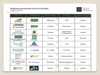 даних M&A Ukraine, за перше півріччя 2017 року здійснено 32 угоди
