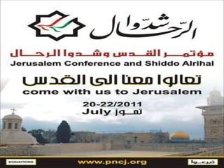 مؤتمر القدس يتناول تعزيز الروابط بين الفلسطينيين في الشتات وأهالي القدس لدعم صمودهم في وجه الاحتلال. يسعى المؤتمر إلى إنشاء حملة سنوية لدعم القدس وتأكيد حق العودة، مع التركيز على الجوانب الإنسانية والمعنوية والاقتصادية. المؤسسة منظمة غير ربحية مسجلة في الولايات المتحدة وتضم هيئات متعددة لتعزيز التعاون بين الجاليات الفلسطينية.