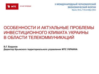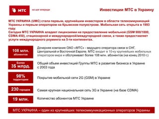 Документ рассматривает инвестиционный климат Украины в области телекоммуникаций, акцентируя внимание на роли компании МТС Украина как главного инвестора с объемом инвестиций более 3 млрд долларов с 2003 года. Тем не менее, выявлены серьезные преграды для дальнейших инвестиций, в том числе бюрократия и отсутствие четкой государственной стратегии. Для успешной интеграции в глобальную информационную инфраструктуру необходимо устранить эти препятствия и создать благоприятные условия для инвестиций.