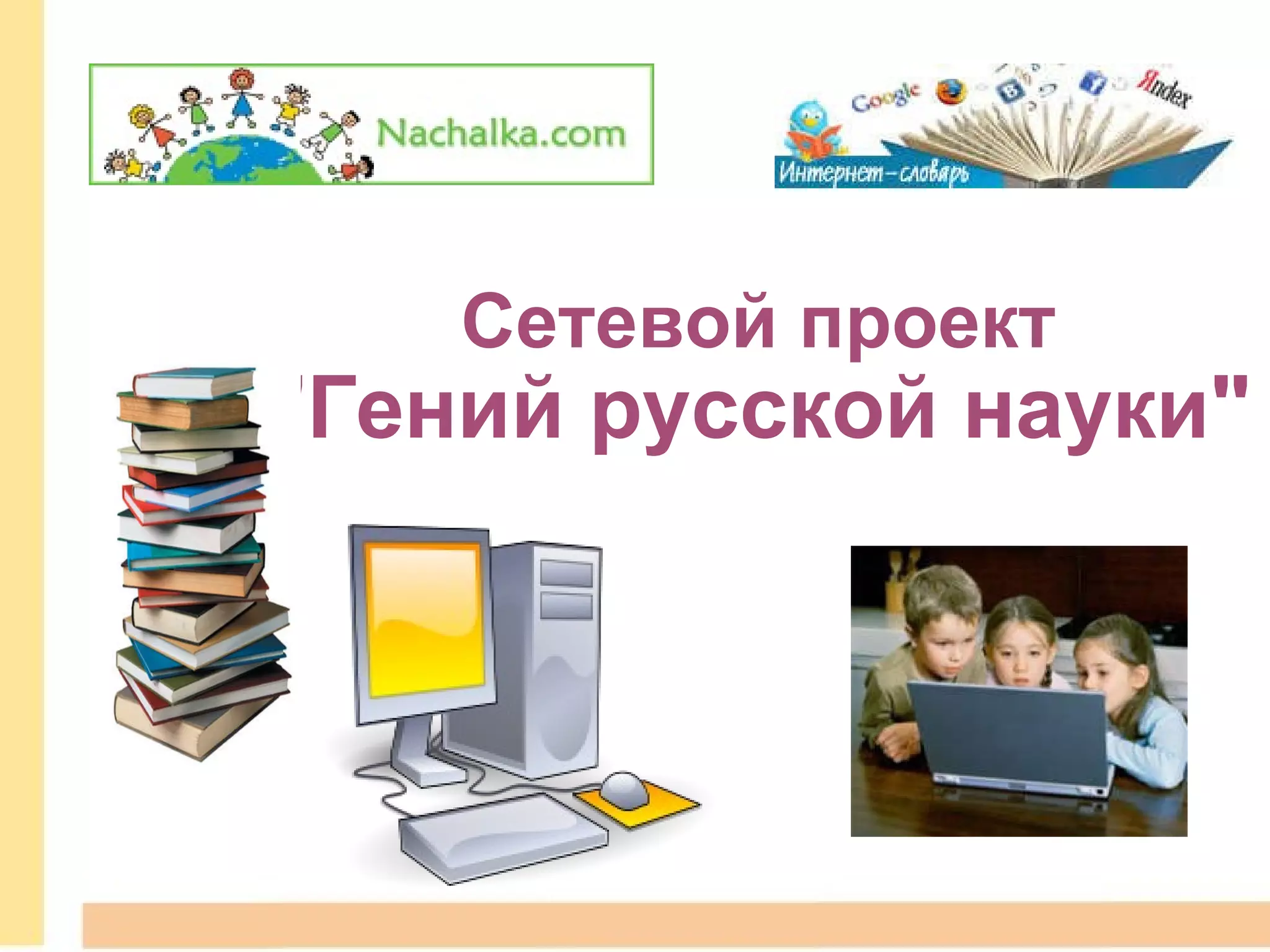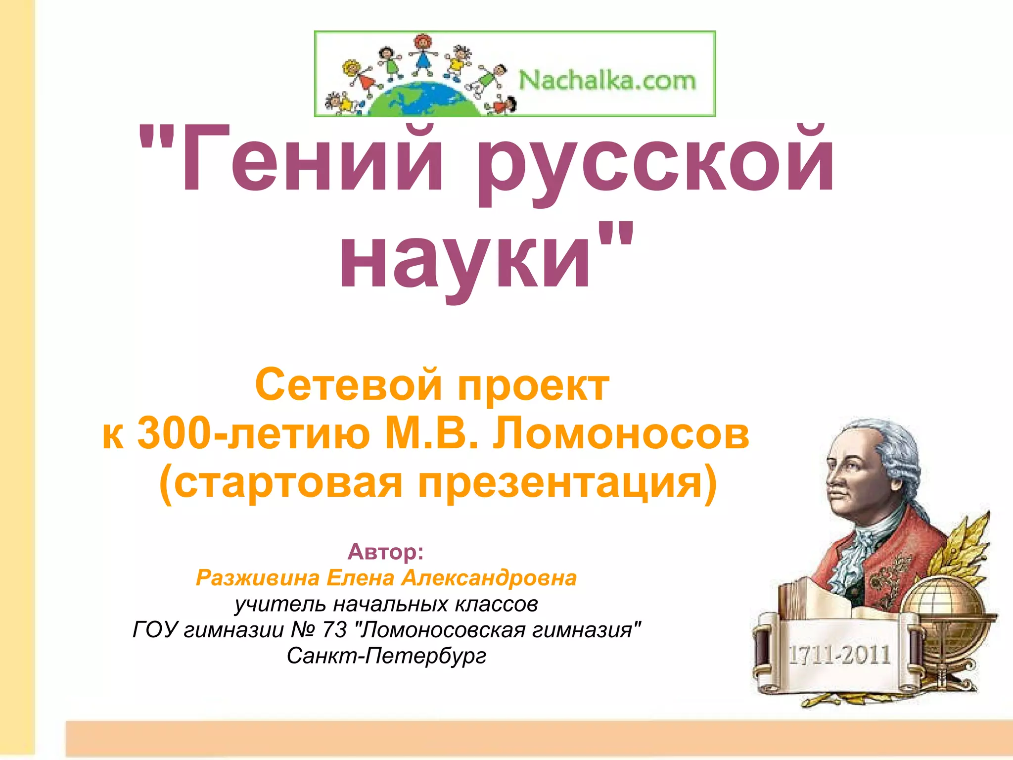 Документ представляет стартовую презентацию сетевого проекта 'Гений русской науки' к 300-летию М.В. Ломоносова, созданного учителем начальных классов Еленой Александровной Разживиной. Проект направлен на исследование вопросов гениальности в науке и культуре, с особым акцентом на вклад Ломоносова. Участники проекта смогут выбрать роли по интересам и изучить биографию и достижения Ломоносова, а также его влияние на российскую науку.