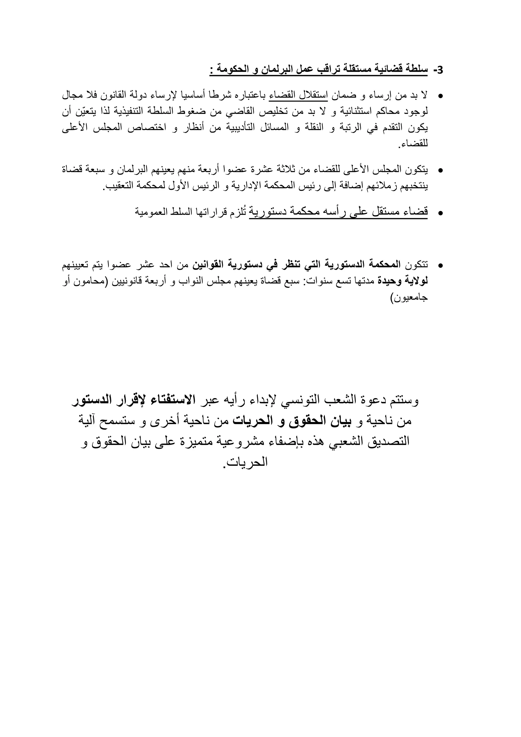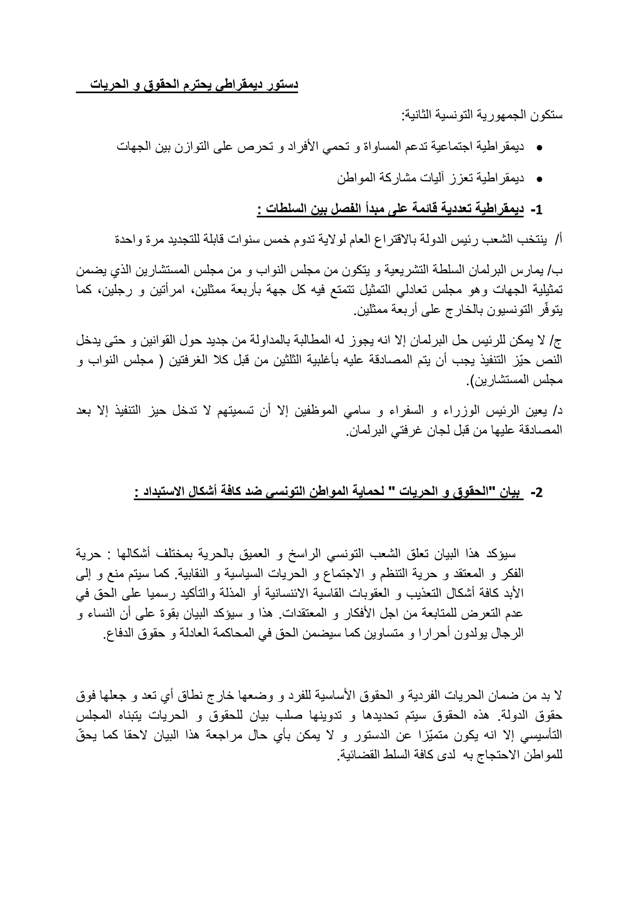 يدعو مشروع الدستور التونسي إلى إنشاء جمهورية ديمقراطية اجتماعية تعزز حقوق المواطن وحرياته، مع التأكيد على الفصل بين السلطات وضمان الاستقلال القضائي. يشمل ذلك انتخاب رئيس الدولة والبرلمان، ووضع حقوق الإنسان والحريات الأساسية في بيان منفصل. كما يتضمن استفتاءً شعبيًا للمصادقة على الدستور وبيان الحقوق.