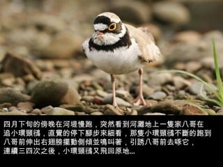 该文档讲述了一只小环颈鹤的孵化和成长过程,在观察中发现亲鸟通过假装受伤来保护幼鸟,同时也描述了幼鸟出生后的快速成长和学习活动。在经历了多次挑战后,幼鸟在父母的保护下,逐渐适应外部环境。最终,尽管面临捕食者的威胁,幼鸟们在父母的照顾下仍然茁壮成长。