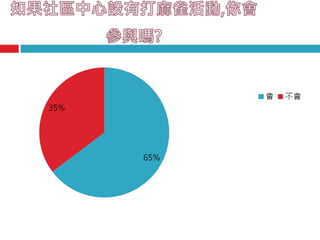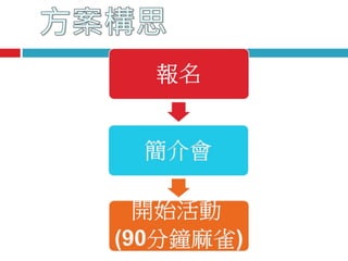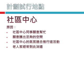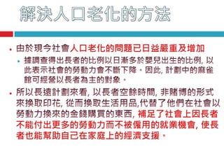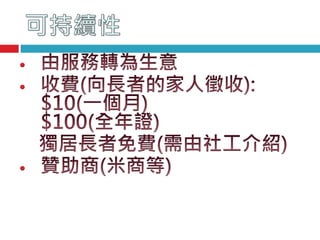 人口老化及長者貧窮的情況不可忽視,該組致力改善長者的全人健康 – 生理、心理及社交,所以構思出一個社區活動,名為「雀樂」。活動以社區中心為主要地點,並不含賭博成分,長者透過活動更能改預防許多疾病形成的風險!