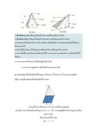 - 32 AB2 = 16 AB = 4 ตอบ สูงเอียงยาว 4 นิ้ว 3.2) การหาความสูงเอียง กรณีที่โจทย์กาหนดส่วนสูง Ex.2 พีระมิดฐานสี่เหลี่ยมจัตุรัสมีด้านฐานยาวด้านละ 10 นี้ว ส่วนสูงยาว 12 นิ้ว จงหาความสูงเอียง วิธีทา วาดรูปพีระมิดฐานสี่เหลี่ยมจัตุรัสขึ้นมาก่อน กาหนดให้ AC เป็นส่วนสูง ยาว 12 นิ้ว และ AB เป็นความสูงเอียง BC เป็นความยาวครึ่งหนึ่งของด้านฐาน ยาว 10 ÷ 2 = 5 นิ้ว ตามทฤษฎีปีทาโกรัส ในรูปสามเหลี่ยม มุมฉาก ABC พิจารณาสามเหลี่ยม ABC AB2 = 122 + 52 AB2 = 144 + 25 AB2 = 169 AB = 13 ตอบ สูงเอียงยาว 13 นิ้ว 3.3) การหาความสูง กรณีโจทย์กาหนดสูงเอียง Ex.3 พีระมิดฐานสี่เหลี่ยมจัตุรัสมีด้านฐานยาวด้านละ 10 นิ้ว สูงเอียงยาว 13 นิ้ว จงหาความสูง วิธีทา วาดรูปพีระมิดฐานสี่เหลี่ยมจัตุรัสขึ้นมาก่อน
