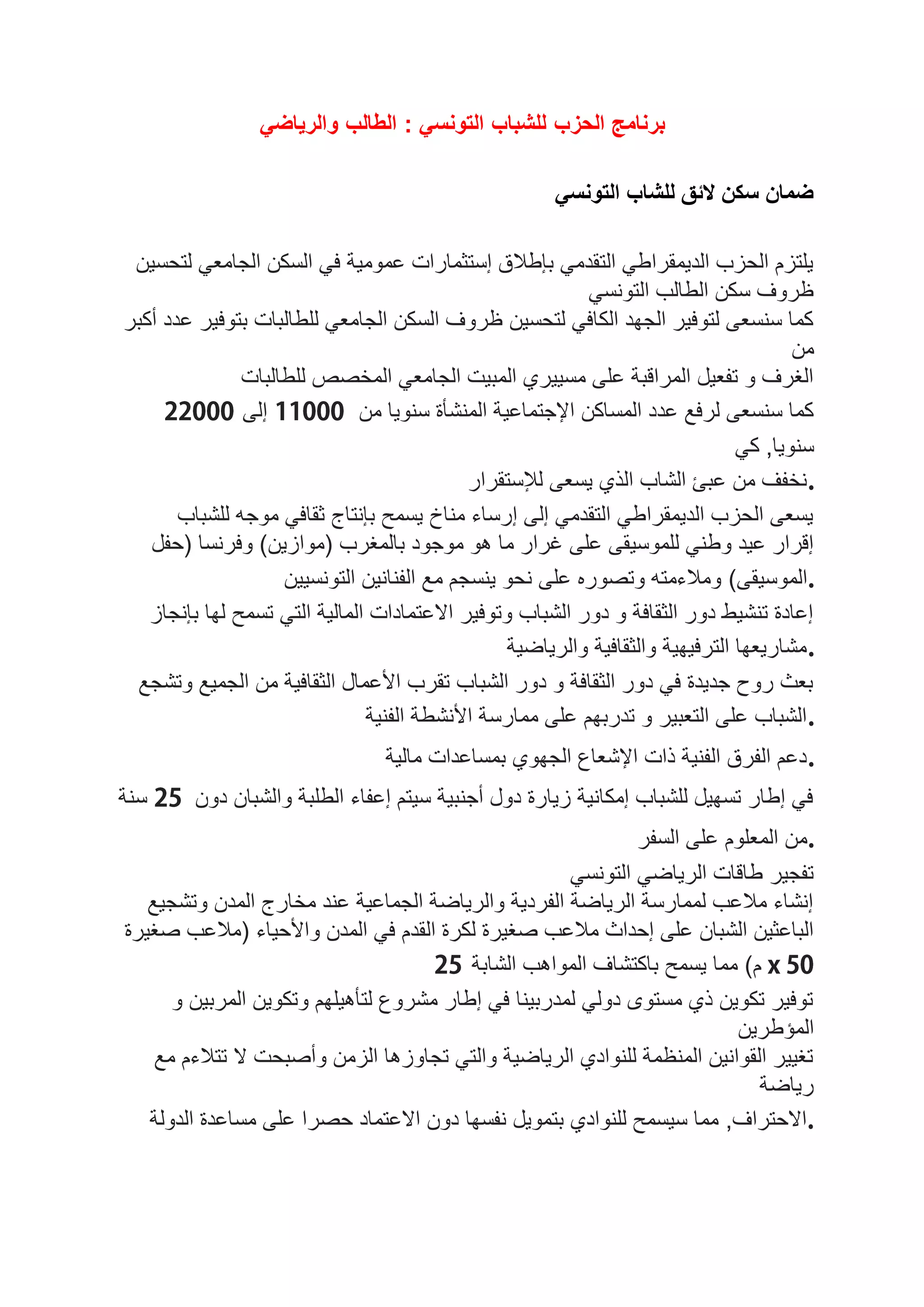 يهدف الحزب الديمقراطي التقدمي إلى تحسين ظروف سكن الطلاب في تونس من خلال استثمار في السكن الجامعي وزيادة عدد المساكن الاجتماعية. يسعى الحزب إلى تعزيز الثقافة والرياضة بين الشباب عبر دعم الفنون وتوفير فرص السفر والتدريب للمدربين، بالإضافة إلى تحديث القوانين المنظمة للنوادي الرياضية. كما يشمل البرنامج إنشاء معهد عالي المستوى لأبطال ألعاب القوى وتجهيزها بتكنولوجيا متقدمة.