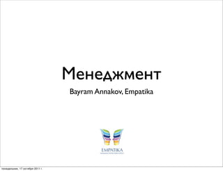 Документ представляет собой материалы о менеджменте от Байрама Аннакова, включая темы управления, подходы к взаимодействию в команде и инструменты для оценки бизнес-процессов, такие как воронка продаж. Обсуждаются цели управления, а также различные аспекты, связанные с планированием и мотивацией. В конце предлагается литература для дальнейшего изучения управленческой мысли.