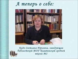 Светлана Юрьевна Кадо, заведующая библиотекой Кыштовской средней школы, делится своим опытом и достижениями в области библиотечного дела, включая победы её учеников на конкурсах. Она подчеркивает важность постоянного обучения для современного библиотекаря и делится ссылками на свои страницы в интернете. Кадо также желает удачи участникам курсов, в которых она принимает участие.