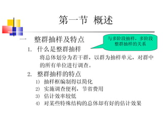 整群抽样是一种将总体划分为多个群体,并对整个群体进行调查的抽样方法。其特点包括简化抽样框、便于实施并节省费用,但估计效率较低。文档详细探讨了群的划分、规模、估计量性质及群规模相等和不等时的估计方法。
