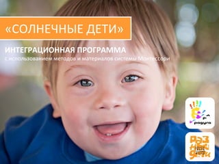 Документ описывает интеграционную программу, направленную на социализацию детей с синдромом Дауна и другими особыми потребностями через образовательную методику Монтессори. Программа включает занятия с участием как здоровых, так и особенных детей, предоставляет уникальную развивающую среду и ставит целью формирование толерантности и уважения в обществе. В документе также изложены планы по популяризации проекта и взаимодействия с родителями и окружающими для изменения общественного отношения к детям с ограниченными возможностями.