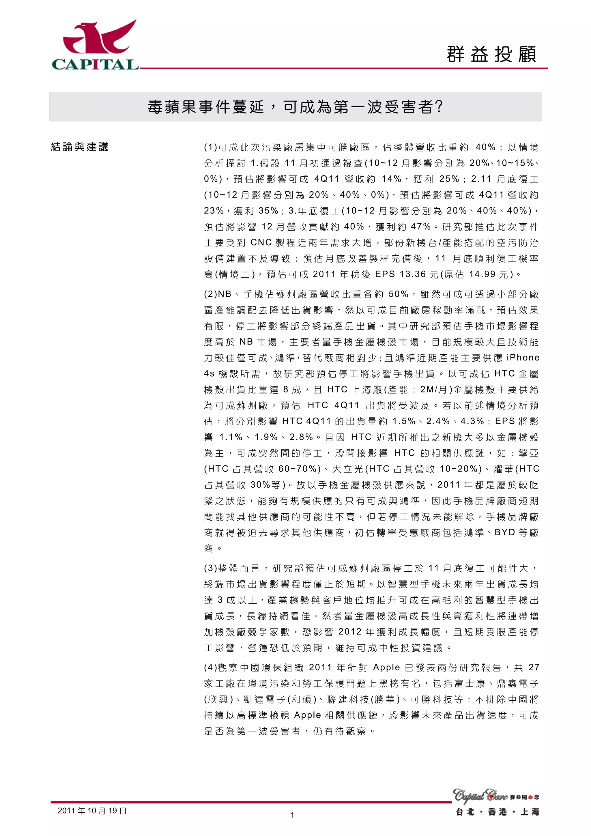 可成科技的蘇州廠因環境污染事件被勒令停工,預估將對其營收和獲利造成影響。研究部分析了不同復工情境對於可成的2021年第四季營收和每股收益的潛在影響,並指出手機市場受損程度高於筆記本市場。總體而言,預計在改善工作完成後,11月底復工的可能性較大,但短期影響仍需觀察。