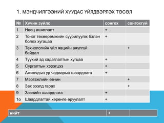 1. МЭНДЧИЛГЭЭНИЙ ХУУДАСҮЙЛДВЭРЛЭХ ТӨСӨЛ