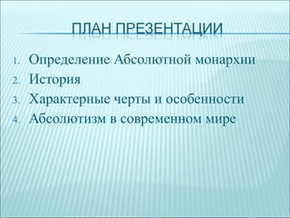 Абсолютная монархия — это форма правления, где вся власть сосредоточена в руках монарха, осуществляющего исполнительную и законодательную власть с помощью различных органов. Впервые ярко проявился абсолютизм в XVII-XVIII веках в Западной Европе, а в России — с XVIII по начало XX века. В современном мире некоторые государства, такие как Саудовская Аравия и Бруней, остаются абсолютными монархиями, в то время как Ватикан не является таковой из-за отсутствия наследственной власти.