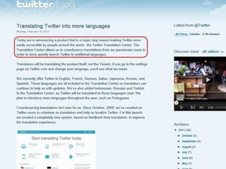 مشروع تعريب تويتر هو مبادرة تقودها سفراء التغرّيد العرب بالتنسيق مع تويتر، يهدف إلى ترجمة محتوى الموقع إلى اللغة العربية من خلال متطوعين. تويتر يدعم المشروع لكنه لم يحدد موعداً رسمياً لفتح باب الترجمة للغة العربية، إذ ستقوم المنصّة بعرض المحتوى لتصويت المستخدمين العرب بعد ذلك. يتضمن المشروع إعداد قواعد تفصيلية للترجمة ومعجم كامل للمصطلحات المُعربة قبل تسليمها لإدارة تويتر.