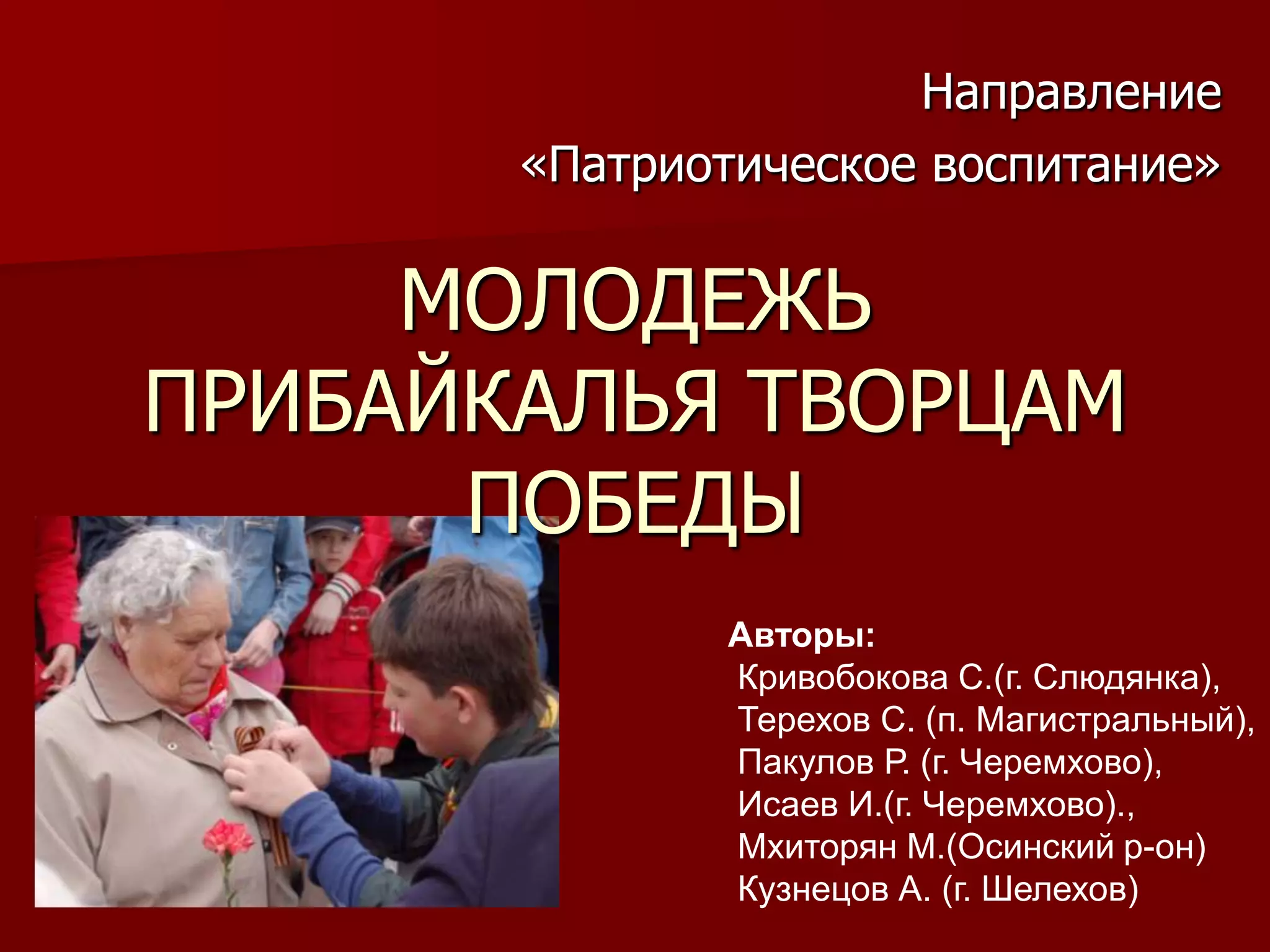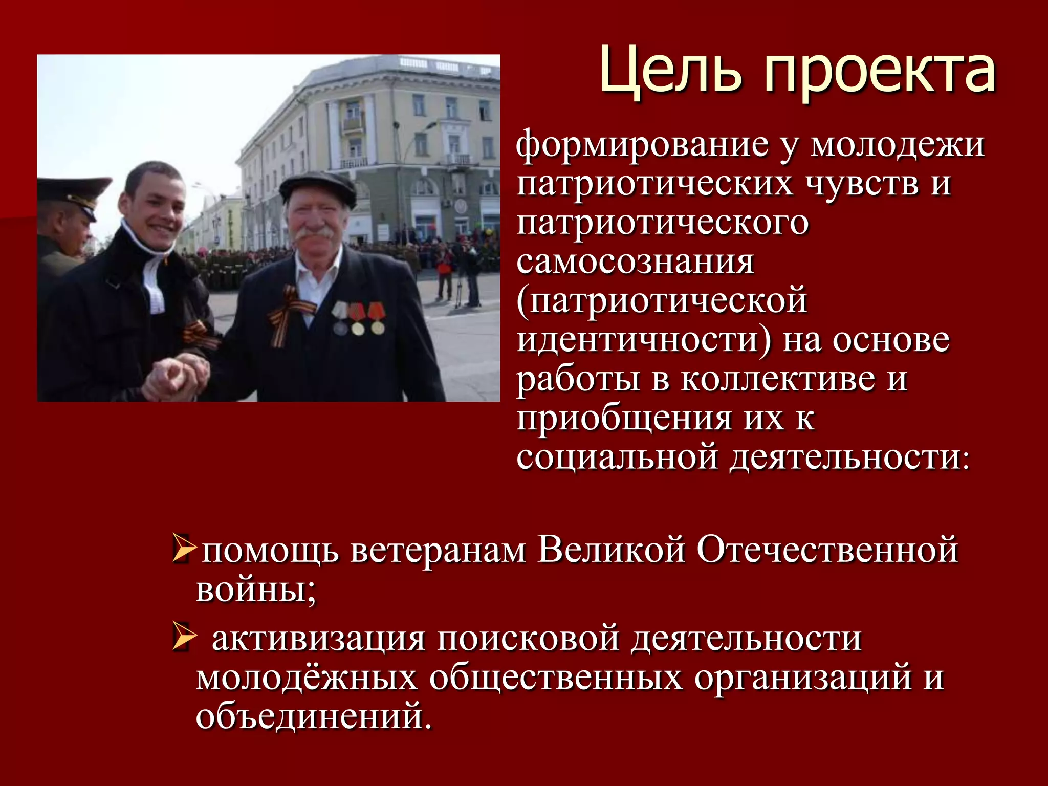 Проект направлен на формирование патриотических чувств у молодежи Прибайкалья через коллективную работу и социальную активность, включая помощь ветеранам Великой Отечественной войны и организацию поисковых мероприятий. Задачи проекта включают создание трудовых и социальных бригад для помощи ветеранам, а также интернет-бригад для архивирования воспоминаний и уточнения данных о ветеранах. Проект поддерживается государственной программой патриотического воспитания и целевыми программами Иркутской области.
