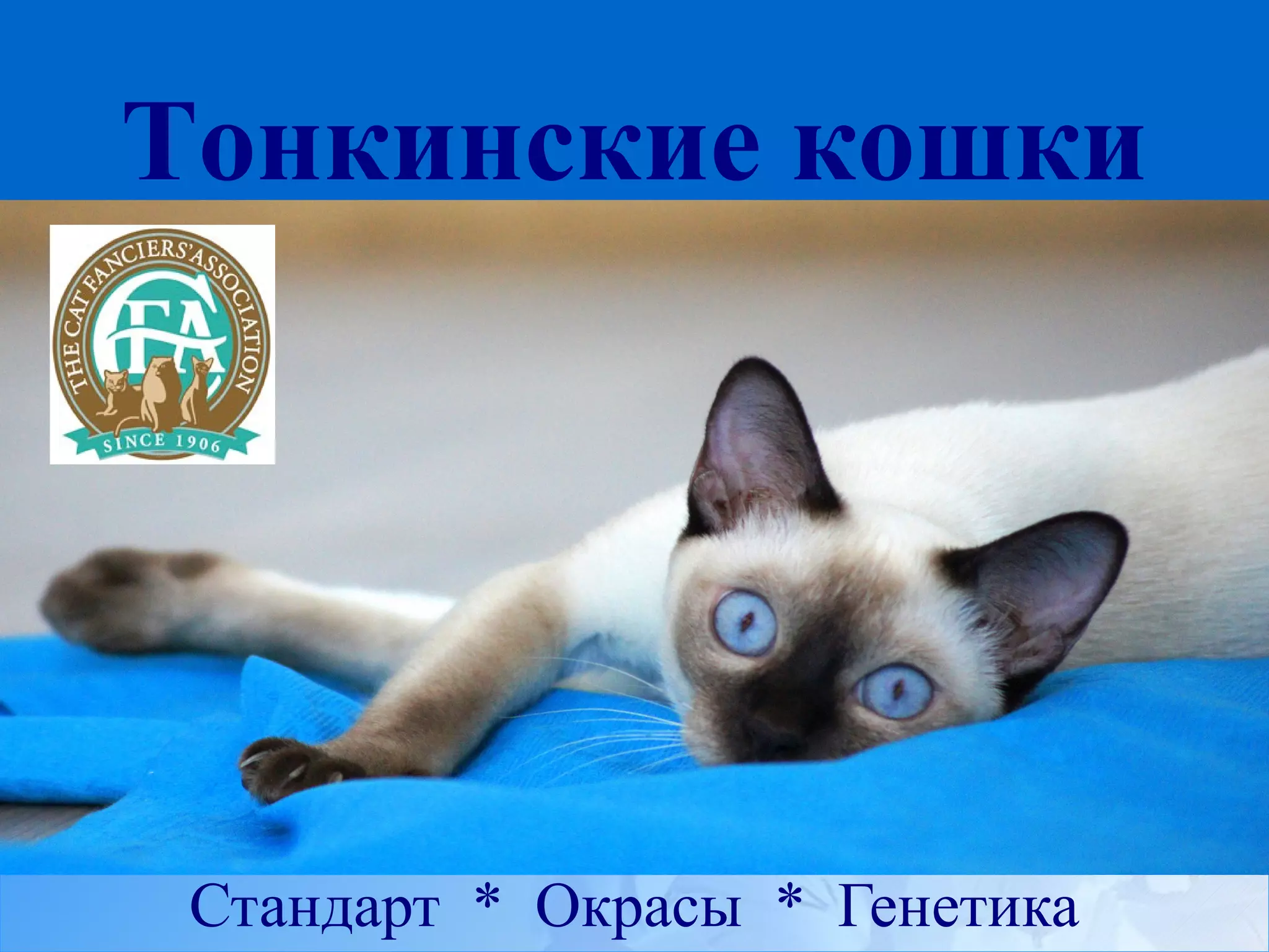 Документ описывает стандарты породы тонкинских кошек, включая основные характеристики, такие как размеры, форма головы, ушей и глаз, а также текстуру шерсти и окрасы. Особое внимание уделяется генетическим аспектам окраса и цвету глаз, которые зависят от различных физических механизмов. В документе также упоминаются недостатки, которые могут проявляться у данной породы.