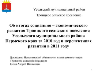 Доклад о социально-экономическом развитии троицкого сельского поселения за 2010 год и перспективах на 2011 год включает данные о демографии, экономическом развитии, занятости и бюджетных показателях. Число безработных граждан составило 20 человек, а численность населения уменьшилась с 2006 до 1885 человек. Отмечается необходимость реформирования малоперспективных населенных пунктов и план по развитию инфраструктуры.