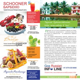 Гид по Гоа сезона 2011 года предлагает советы путешественникам о лучших местах для отдыха, развлечений и культурных достопримечательностей в этом индийском штате. В документе представлены информация о пляжах, отелях, ресторанах и медицинских центрах, а также рекомендации по размещению и активному отдыху. Гид акцентирует внимание на уникальной атмосфере Гоа, привлекающей туристов своим экзотическим шармом и разнообразием.