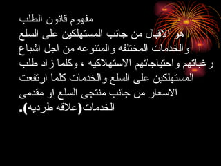 تناقش الوثيقة مفهومي قانون الطلب والعرض في الاقتصاد، حيث يشير قانون الطلب إلى زيادة الإقبال على السلع والخدمات مع ارتفاع الأسعار، بينما يشير قانون العرض إلى زيادة توفير السلع والخدمات مع ارتفاع الأسعار. كما تتناول العوامل المؤثرة على كل من الطلب والعرض، مثل ذوق المستهلك والأسعار والظروف الاقتصادية. تتضمن الوثيقة أيضًا أسئلة للتقويم والنشاط لتحفيز التفكير النقدي حول الواردات والصادرات والاكتفاء الذاتي.