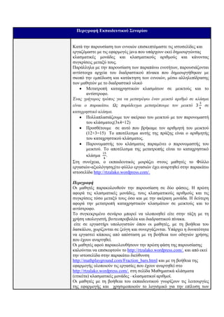 δηαδξαζηηθνύ πίλαθα θαη δεηά από ηνπο καζεηέο λα αληηζηνηρίζνπλ ηηο εηθόλεο κε ηα θαηαρξεζηηθά θιάζκαηα πνπ απεηθνλίδνπλ. Σηε ζπλέρεηα αληηζηνηρνύλ θαηαρξεζηηθά θιάζκαηα κε κεηθηνύο αξηζκνύο θαη ζπγθξίλνπλ κεηθηνύο αξηζκνύο κεηαμύ ηνπο Σεκ. Ο εθπαηδεπηηθόο ζπληνλίδεη θαη ππνζηεξίδεη ην έξγν ησλ εθπαηδεπνκέλσλ παξέρνληαο ηελ θαηάιιειε πιεξνθόξεζε ηε ζηηγκή πνπ ζα ηε ρξεηαζηνύλ Ο εθπαηδεπηηθόο δείρλεη ηελ δεύηεξε εθαξκνγή θαη επεμεγεί ηνλ ηξόπν ιεηηνπξγηάο ηεο. http://www.bbc.co.uk/skillswise/game/ma17frac-game- simplifying-fractions Οη καζεηέο επαλαιακβάλνπλ θάπνηεο από ηηο εξγαζίεο πνπ έρνπλ αλαξηεζεί ζην blog, κε ηελ δεύηεξε εθαξκνγή ε νπνία παξέρεη δηαθνξεηηθό πεξηβάιινλ Οη καζεηέο θαινύληαη λα ιύζνπλ ηηο αζθήζεηο ηνπ θπιιαδίνπ πνπ έρεη αλαξηεζεί ζην blog κε ηίηιν Εξγαζίεο ζηα θιάζκαηα θαη λα 7.4 Φάζε 4: απαληήζνπλ ζηηο εξσηήζεηο ηνπ θπιιαδίνπ Ανεξάπηηηη ππακηική Ο εθπαηδεπηηθόο ζπιιέγεη ηηο απαληήζεηο θαη δηαπηζηώλεη πνηνη θαη ζε εξάζκηζη πνηνλ ηνκέα πζηέξεζαλ. Εκπαιδεςηικά επγαλεία και Τπηπεζίερ Δηαδξαζηηθόο πίλαθαο Ηιεθηξνληθόο Υπνινγηζηήο (Personal Computers) Σύλδεζε ζην Δηαδίθηπν (Internet connection) Λνγηζκηθό παξνπζίαζεο (Microsoft PowerPoint) Ιζηνζειίδεο κε εθαξκνγέο Ψεθηαθά αξρεία δηαδξαζηηθνύ πίλαθα 1) http://mathplayground.com/Fraction_bars.html 2) http://illuminations.nctm.org/ActivityDetail.aspx?ID=11 3) http://www.bbc.co.uk/skillswise/game/ma17frac-game- simplifying-fractions Εκπαιδεςηικοί πόποι 8 Μέζα Ένησπο Υλικό: Σρνιηθό εγρεηξίδην Μαζεκαηηθώλ Ση’ ηάμεο Δεκνηηθνύ, Κεθάιαην 19Ο Φύιιν εξγαζίαο Ηλεκηρονικό- Ψηθιακό Υλικό Ιζηνζειίδεο πνπ θηινμελνύλ ηηο πξνο ρξήζε εθαξκνγέο I. http://mathplayground.com/Fraction_bars.html II. http://illuminations.nctm.org/ActivityDetail.aspx?ID=11 III. http://www.bbc.co.uk/skillswise/game/ma17frac-game- simplifying-fractions IV. http://rtzalako.wordpress.com/ Δηαθάλεηεο εμήγεζεο βεκάησλ επίιπζεο πξνβιεκάησλ κε θιάζκαηα
