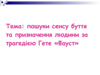 Мета: розглянути філософськіпогляди Гете на призначення людини; формувати етичні погляди на світ; довести, що образ Фауста «вічний»; розвивати вміння сприймати художній твір як явище мистецтва; учити висловлювати своє ставлення до проблеми та аргументувати свою точку зору; виховувати активну життєву позицію