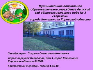 Муниципальное дошкольное образовательное учреждение детский сад общеразвивающего вида No 3 «Теремок» в Котельниче оснащено всем необходимым для работы и обладает современным педагогическим коллективом. Учреждение предлагает разнообразные образовательные услуги и активно участвует в спортивных мероприятиях, обеспечивая развитие детей. На территории детского сада созданы безопасные условия с соответствующими объектах для физического и эстетического развития воспитанников.
