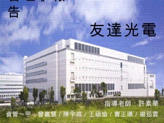友達光電股份有限公司成立於1990年,由達碁科技與聯友光電合併而成,主要專注於薄膜電晶體液晶顯示器模組的研發與生產。公司以誠信為核心價值,致力於成為全球頂尖的顯示器企業,並透過組織重組與人才培養加強其市場競爭力。友達也強調環境保護與社會責任,積極投入公益和教育研究領域。