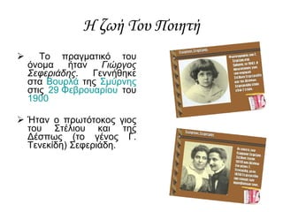Η ζωή ΤουΠοιητή Το πραγματικό του όνομα ήταν Γιώργος Σεφεριάδης . Γεννήθηκε στα Βουρλά της Σμύρνης στις 29 Φεβρουαρίου του 1900 Ήταν ο πρωτότοκος γιος του Στέλιου και της Δέσπως (το γένος Γ. Τενεκίδη) Σεφεριάδη.
