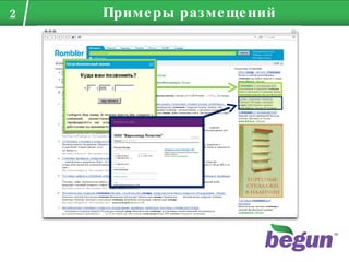 Документ описывает основные аспекты интернет-маркетинга и рекламы, включая примеры размещений для малых, средних и крупных бизнесов. Рассматриваются методы таргетирования аудитории, оптимизация рекламных кампаний и специфика каналов распространения рекламы. Приведены практические примеры из различных отраслей, таких как розничная торговля, ипотечное кредитование и туристические услуги.