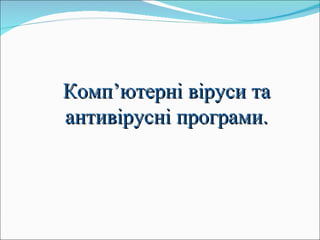 Правила, які требазнати та виконувати, щоб не наражатися на комп ’ ютерні віруси : У становити на комп ’ ютер сучасну антивірусну програму та оновлювати її. Періодично п еревіряти диски комп ’ ютера на наявність вірус ів . Не забувати робити копії цінної інформації на дискети чи компакт-диски . Під час ро боти на інших комп ’ ютерах захищати дискети від запису , щоб віруси не змогли проникнути до них, а потім з ’ явитися на тво єму комп ’ ютер і . Працюючи з електронною поштою, ніколи не відкрива й електронного листа, у в місті якого ти не впевнений чи не знаєш , хто тобі його надіслав. Файли-вкладення, що над ходять разом із листом , можуть містити комп ’ ютерні віруси.
