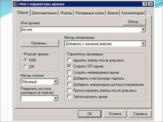 Архівування 2. Увікні архіватора, що з ’ явиться на екрані, у вкладці Загальні обрати назву архіву. 3. Зазначити, у якій папці має зберігатися архів. Для того, щоб визначити шлях до потрібної папки, використовуємо кнопку Перегляд . 4. Обрати програму-архіватор , за допомогою якої стискатимемо дані. Для цього у вікні Формат архіву встановити відповідний перемикач біля назви обраної програми. 5. У рядку вибору Методу стиснення обрати один із пропонованих варіантів. 6. Натиснути OK .