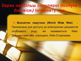 1) Всесвітня павутина (World Wide Web ) - Призначена для доступу до електронних документів особливого роду, які називаються Web-Документами або, спрощено, Web-Сторінками. Зараз найбільш популярні послуги (сервіси) Інтернету - це: