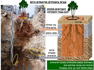 בניגוד לארצות צפוניות בהן קיימים גשמי קיץ, הבעיה בארץ היא מחסור במים ולא מחסור באוויר, ובכך יש להתמקד, לצד הקמה של מערכות השקיה שיפתחו מערכות שורשים מיטבית ולא ייפגעו על ידי שורשים צפופים ורדודים.למדנו את מבנה הקרקע והסלע ואת השונות בהם בעיר בעזרת חישופי שורשים בקטעים שבהם התחייבה עקירת עצים לצורך חידוש תשתיות (ראו קישור לעיל) ראינו שבעצים שגודלו ב"תעלת גידול" התפתחה מערכת שורשים דקה וצפופה מתחת לצוואר השורש כתוצאה מממעגל הטפטוף הקטן שהיה סביב העץ, אבל שורשים פרצו לאורך תעלת הגידול ומתחתה על הקרקע החרסיתית בעומק, ואף בניצב לתעלת הגידול למרחק של מספר מטרים. מערכת ההשקיה הדו שלבית כוללת שלב לטווח הקצר שבו לאחר 3-2 שנים של השקיה בשני עומקים בבור הנטיעה, תופעל מערכת ההשקיה לטווח ארוך הבנויה מזקפים שבהם יהיה טפטוף מים עד לעומק במרחק מהגזע. אנו משתדלים להימנע מהידוק (הנדרש על ידי מהנדסי התכן) באזור השורשים. במצב המוצע, בו אין כמעט הפרה של מרקם הקרקע המקומית, מספיק הידוק אחד מתחת למצעים.
