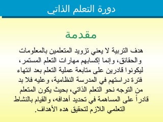تتناول الوثيقة أهمية التربية الذاتية للتعلم في الإطار الإسلامي، حيث تسعى لتزويد المتعلمين بمهارات التعلم المستمر وتحفيزهم على التعلم الذاتي. تبرز الوثيقة دور التعلم الذاتي كعملية تفاعلية تسهم في تطوير شخصية المتعلم ومهاراته، مما يعد ضروريًا لمواجهة تحديات الحياة. كما تقارن الوثيقة بين التعليم التقليدي والتعلم الذاتي، مبرزة مميزات الثاني في تعزيز الإبداع والتفكير النقدي.