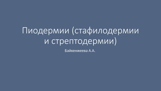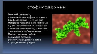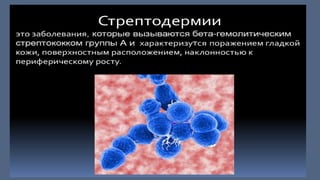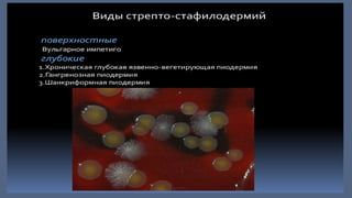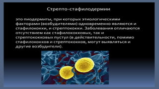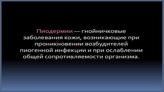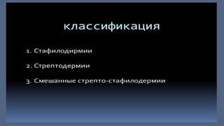 Документ детализирует виды пиодермии, такие как стафилодермия и стрептодермия, с их классификацией и специфическими клиническими проявлениями. Описаны как поверхностные, так и глубокие формы заболеваний, их симптомы, течения и последствия. Также представлены рекомендации по диагностике и лечению различных форм пиодермии с использованием антибактериальных препаратов.