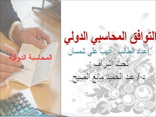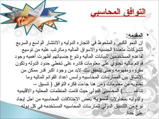 تتناول الوثيقة المعايير الدولية للمحاسبة وأهميتها في تنظيم المعلومات المالية للشركات متعددة الجنسيات، حيث تسعى لتوحيد الممارسات المحاسبية عبر الحدود. كما تبرز أهمية هذه المعايير في تحسين جودة وتوقيت التقارير المالية وتسهيل التوافق بين القوائم المالية للدول المختلفة. توضح الوثيقة أهداف المعايير الدولية ودورها في الحد من الفوضى المحاسبية وضمان العدالة والمهنية في تقديم المعلومات المالية.