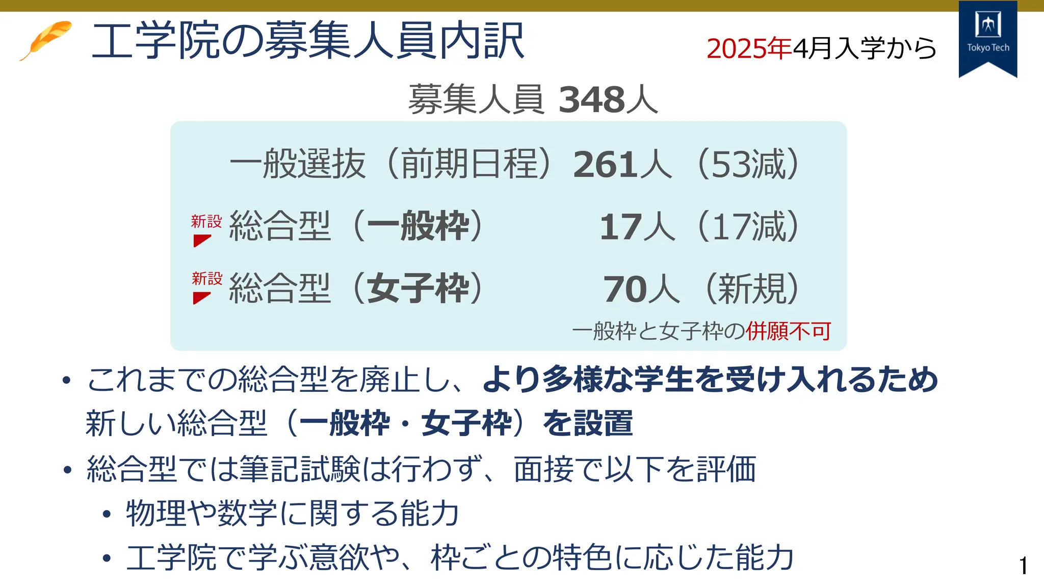 東京工業大学工学院では2025年度入試から、これまでの総合型選抜を廃止し、一般枠と女子枠からなる総合型選抜を開始します。 ●新しい総合型・学校推薦型選抜(一般枠・女子枠)をご検討の方へ https://admissions.titech.ac.jp/admissions/admission/admission/new-exams ●東京工業大学 高校生・受験生向けサイト https://admissions.titech.ac.jp
