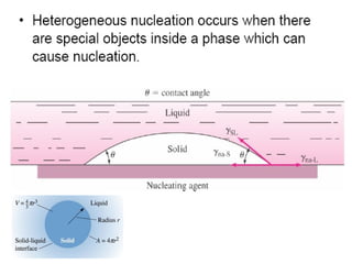 The document discusses various processes and phenomena related to the solidification of metals and alloys, including nucleation, undercooling, and solidification defects. It describes different casting methods such as sand casting, investment casting, and die casting, along with their applications. Additionally, it covers techniques for controlling microstructures in solidified materials and the methods of joining metallic materials through processes like brazing and fusion welding.