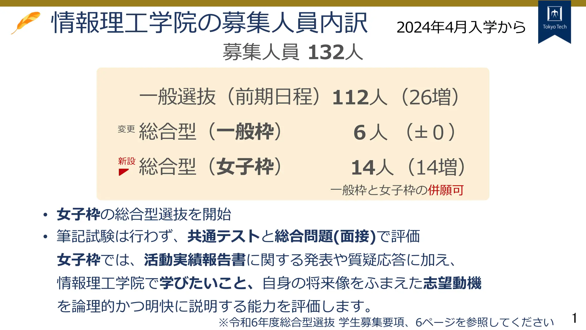 東京工業大学情報理工学院では2024年度入試から、全体の募集人員を増加し、女子枠の総合型選抜を開始します。 ●新しい総合型・学校推薦型選抜(一般枠・女子枠)をご検討の方へ https://admissions.titech.ac.jp/admissions/admission/admission/new-exams ●東京工業大学 高校生・受験生向けサイト https://admissions.titech.ac.jp