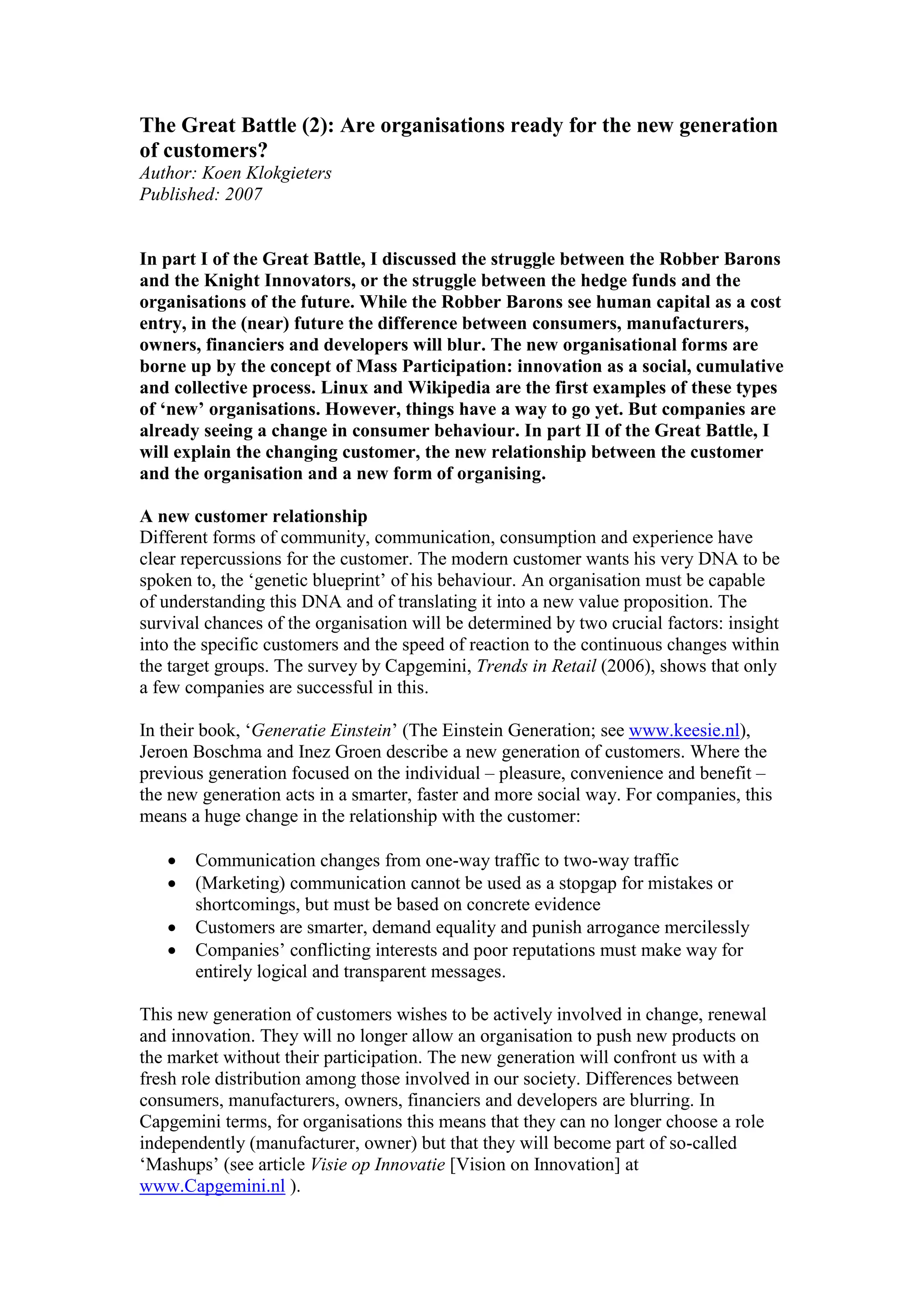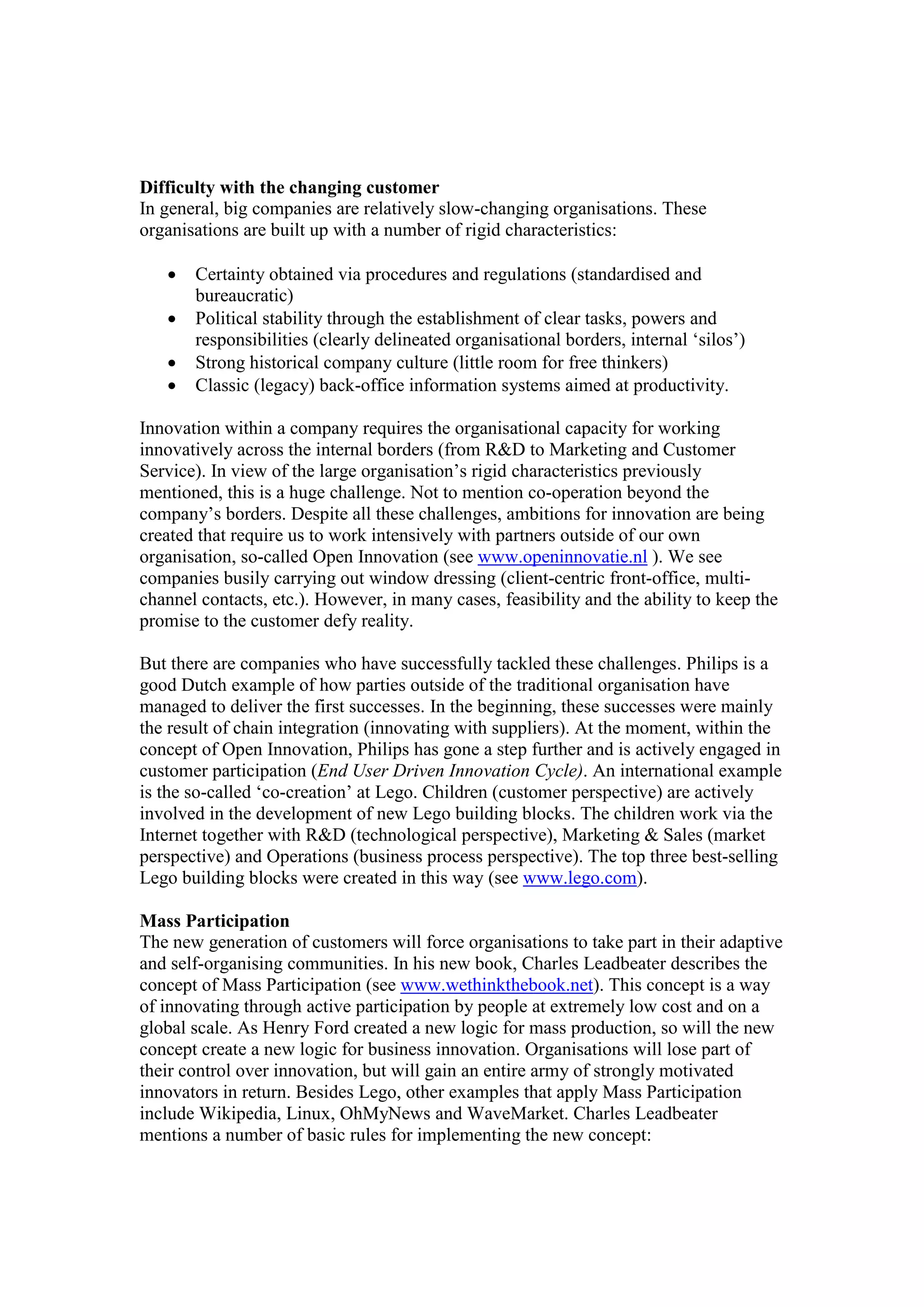 The document discusses how organizations need to adapt to a new generation of customers who expect more involvement and transparency. It outlines how communication is shifting from one-way to two-way, and how customers demand equality and punish arrogance. This new generation wants to participate actively in innovation. The document also notes that large organizations find it challenging to change and innovate due to rigid structures, but that some like Philips and Lego are starting to engage customers in co-creation. It introduces the concept of "Mass Participation" where customers help drive innovation at low costs through peer-to-peer participation.