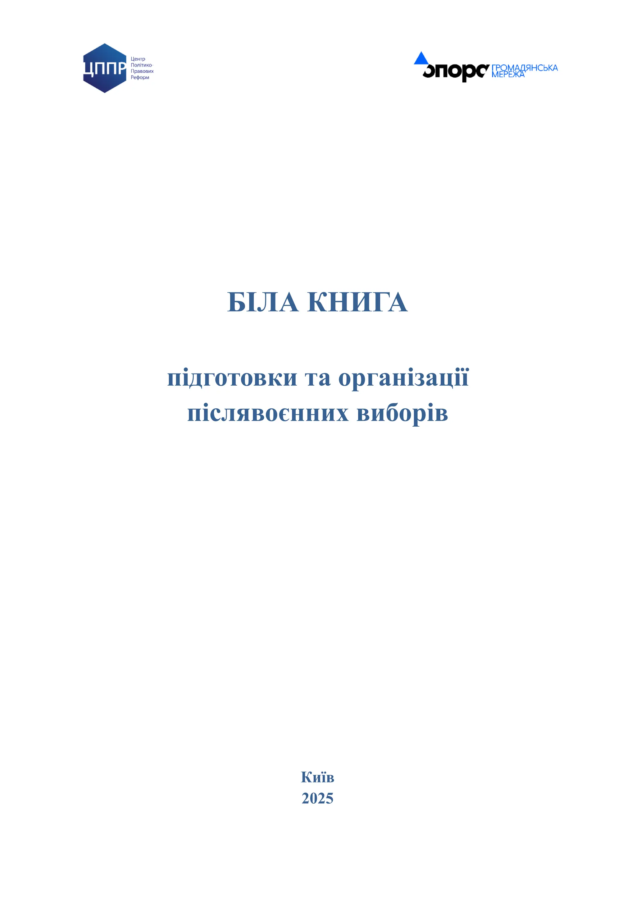 Біла книга підготовки та організації післявоєнних виборів підготовлена з метою комплексного формування та висловлення позиції трьох партнерських організацій щодо викликів, спричинених війною, які впливатимуть на організацію і проведення виборів та шляхи їх подолання або мінімізації. Експертами досліджено вже очевидні та ймовірні проблеми, які матимуть місце на різних стадіях виборчих процесів загальнодержавних післявоєнних виборів, та наведено чіткі пропозиції щодо їх усунення. Матеріал підготовлено на основі аналізу виборчого законодавства, офіційних документів органів державної влади, статистичних даних, а також інформації, отриманої експертами внаслідок проведених інтервʼю зі стейкхолдерами, які повʼязані/беруть участь у виборчому процесі, публічних громадських обговорень, регіональних фокус-груп, а також обговорення за участі народних депутатів України, представників Центральної виборчої комісії, інших органів державної влади та провідних експертів.